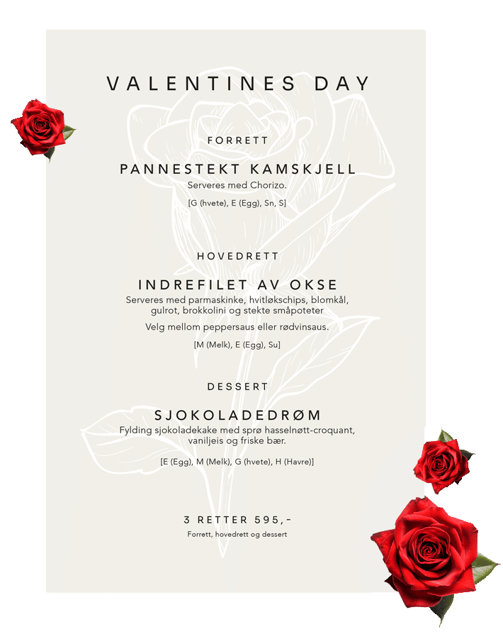 Snart er dagen her og du kan nyte vår spesialkomponerte Valentines meny sammen med din kjære.